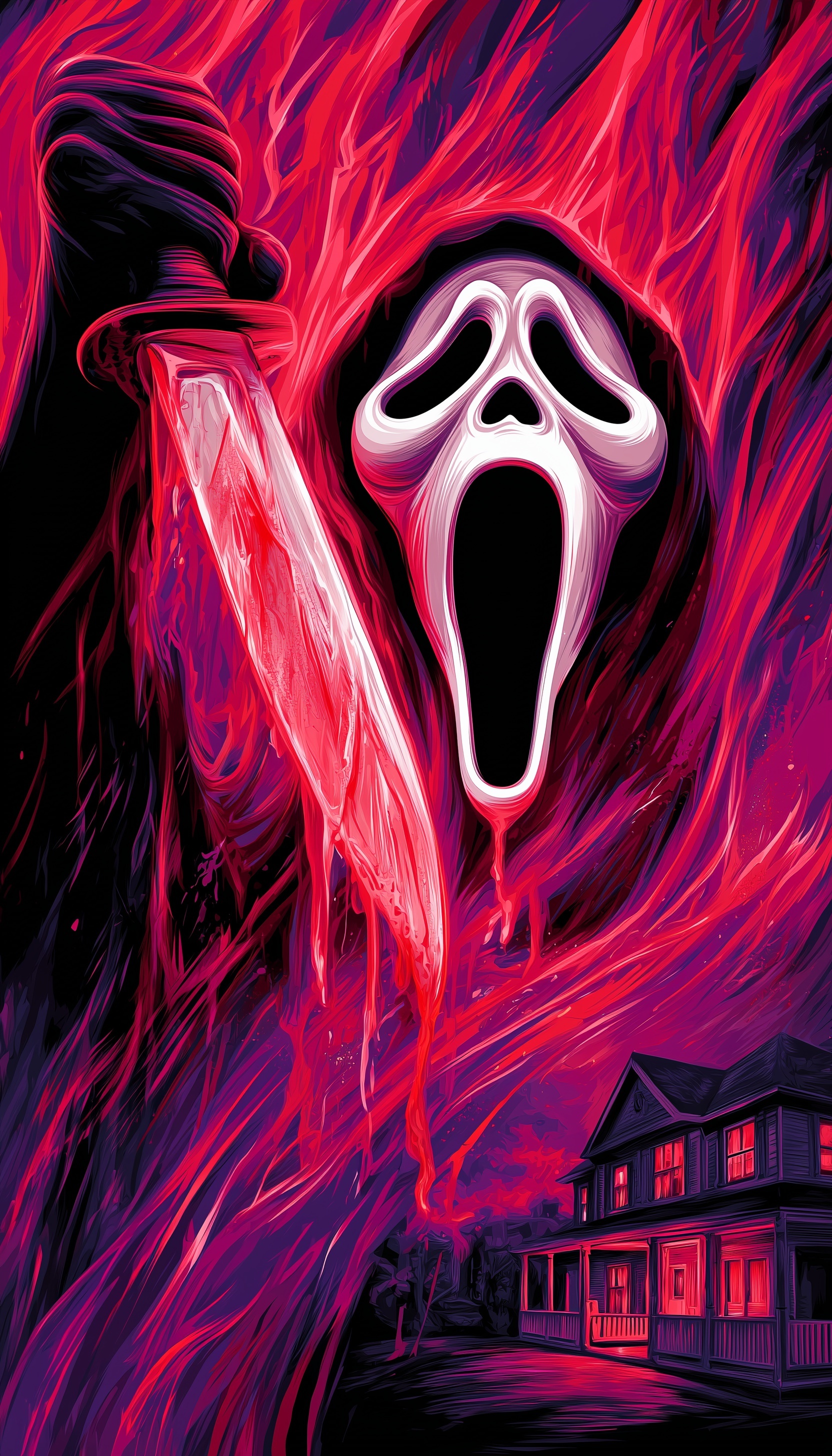Digital art of Ghostface, glowing white mask warped into a screaming expression, eye sockets glowing, knife raised dripping with crimson aura, deep shadowed background, high-contrast shading with warped cartoon energy. house and front yard in background.