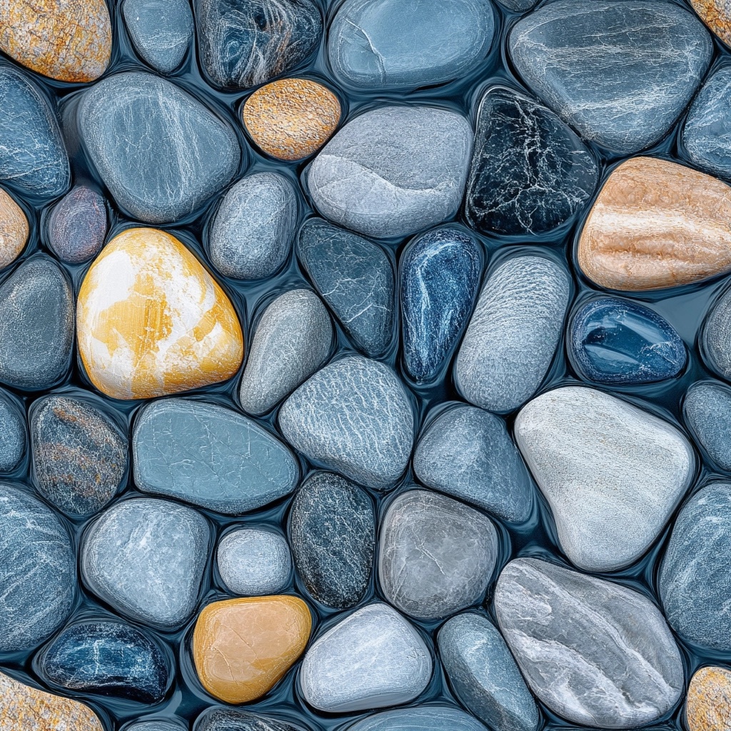 Many pebbles and gems in the water, gray-white-blue-yellow color scheme, high resolution, high detail, high quality, 8k