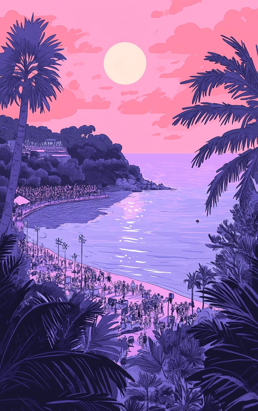 An illustration for a rock festival on french riviera, a scene. no details. purple and pink colors.