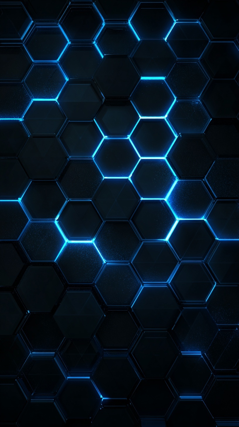 Dark black background with blue glowing hexagons, a wallpaper for your phone.