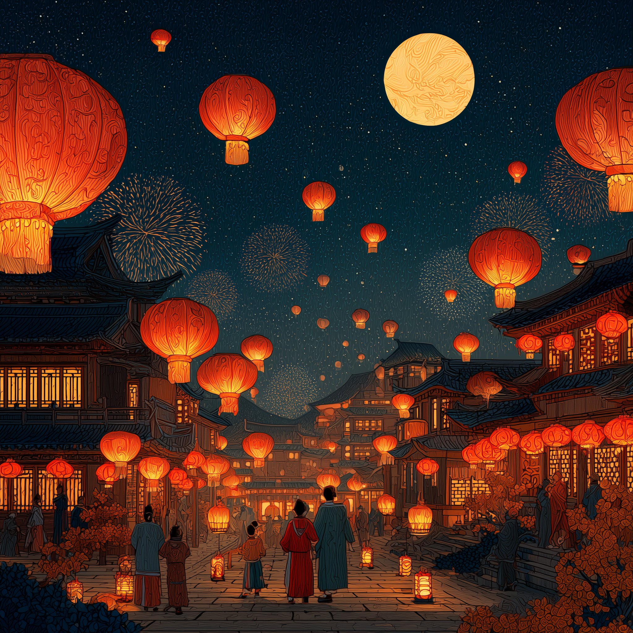 A magical night scene of the Chinese Lantern Festival, hundreds of glowing red lanterns floating into the dark blue sky. Families and children wearing traditional hanfu standing along an ancient Chinese street filled with warm golden lights. Large decorative lanterns shaped like dragons and flowers hanging above. Fireworks softly lighting the sky. The full moon shining brightly in the background. Rich red and gold color palette, warm glowing atmosphere, detailed textures, cinematic lighting, ultra-detailed illustration, festive and joyful mood, high resolution, poster composition.
