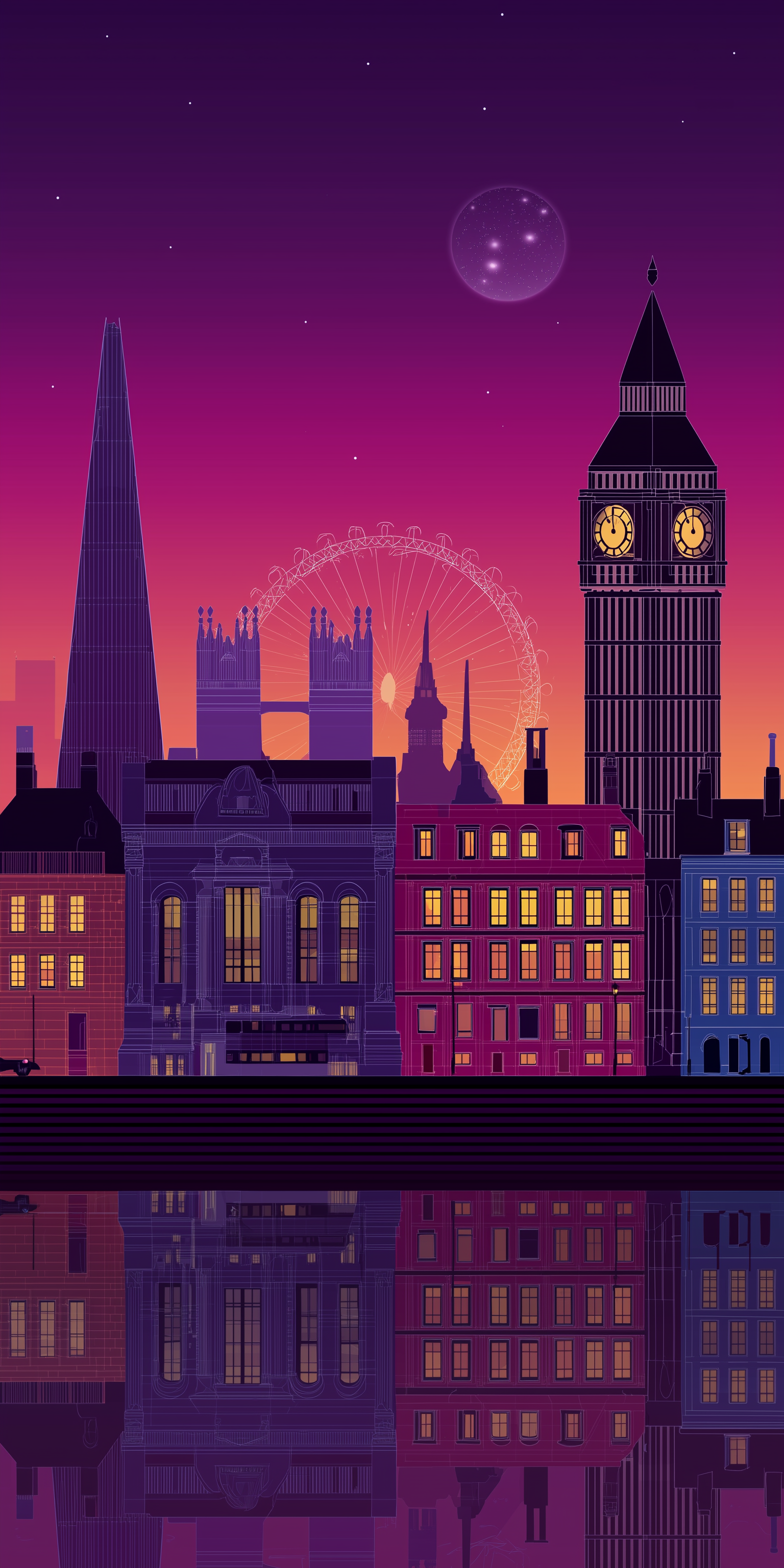 Download Nighttime London Skyline in Flat Design Wallpaper to your phone for free.
