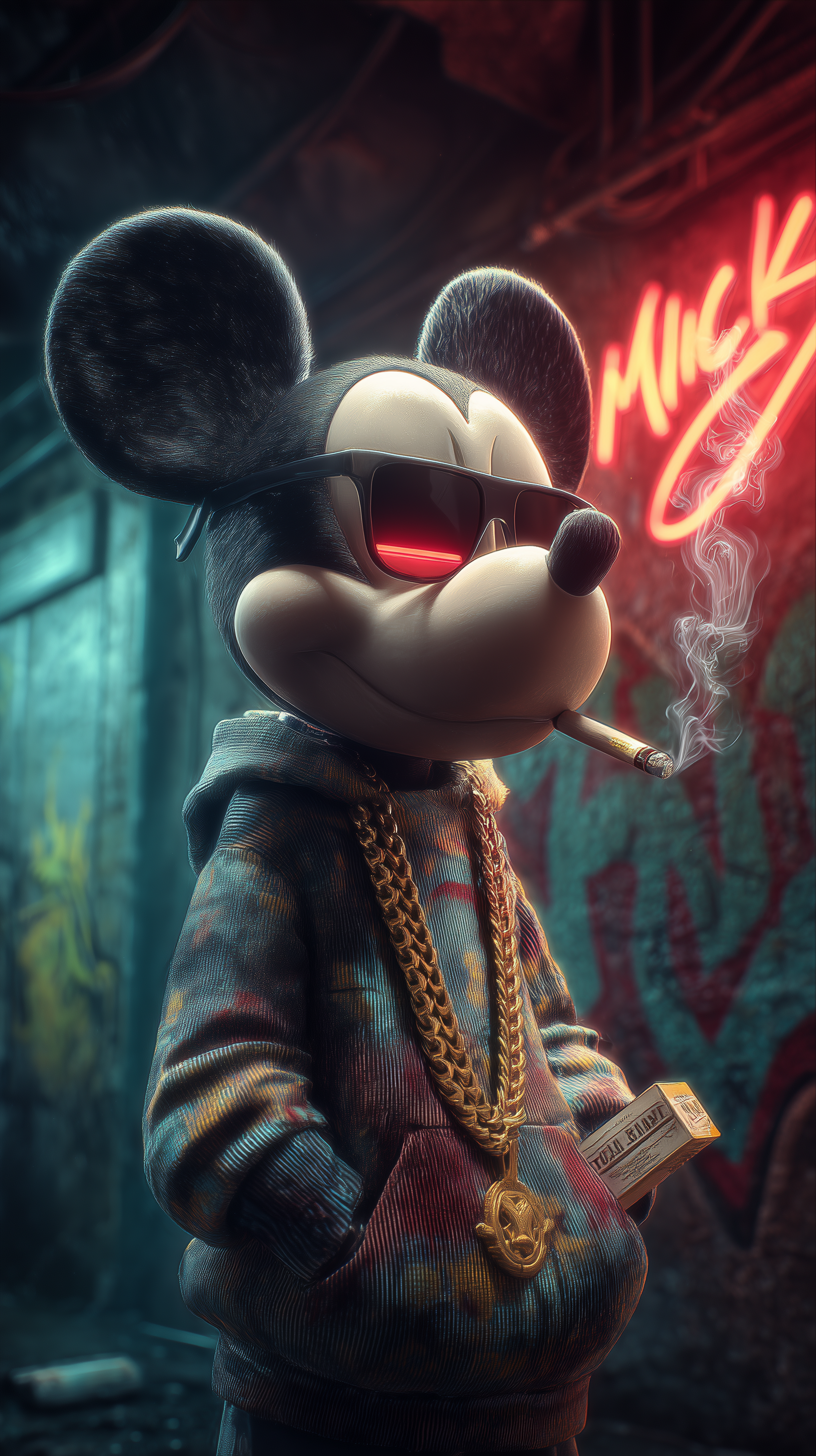 Micky mouse looking high and mischievous, eyes half-closed and glowing red, a lit blunt hanging from his mouth with smoke swirling around his face. He\'s wearing streetwear a hoodie with a trippy pattern, gold chain, and shades pushed up on his forehead. Neon graffiti glows behind him in a dark alleyway, with a faint moonlight casting a cinematic glow. His expression is smug and confident, like he owns the night. Urban, gritty, and surreal vibes with a touch of cartoon flair. He is holding a pack of weed