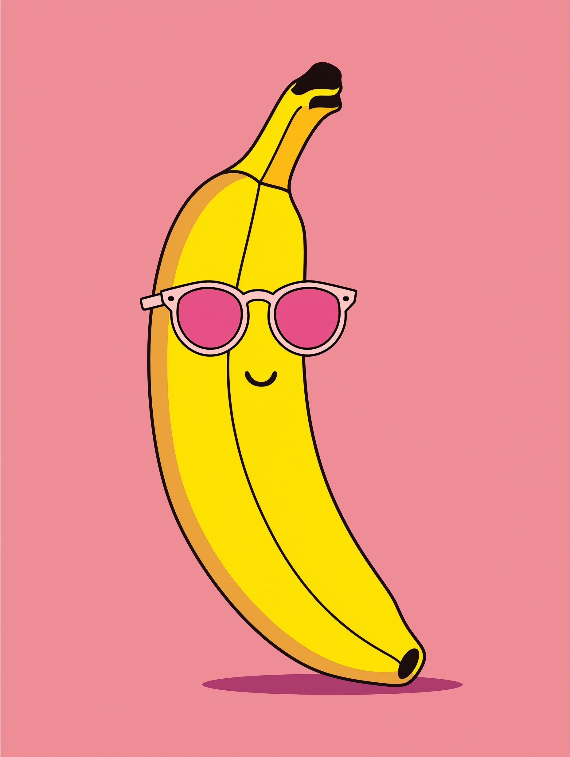 cute cartoon banana with pink sunglasses, simple clean vector style centered composition, limited to three flat pastel colors , portrait, cleaned bold outline adorable and funny concept
